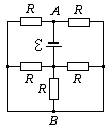 13. Определите разность потенциалов между точками А и В в электрической цепи, показанной на рисунке, если ЭДС источника равна 65 В, а все сопротивления одинаковы. Внутренним сопротивлением источника тока пренебречь.