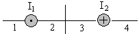 17. В двух бесконечно длинных прямолинейных проводниках, расположенных перпендикулярно плоскости листа, токи I1 и I2=2 I1 теку во взаимно противоположных направлениях. Точка, для которой вектор индукции магнитного поля этих токов равен нулю, находится на участке