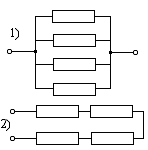 14. Батарея из четырех одинаковых сопротивлений, соединенных по схеме 1), имеет общее сопротивление R1. Общее сопротивление батареи из этих же сопротивлений, соединенных по схеме 2) равно